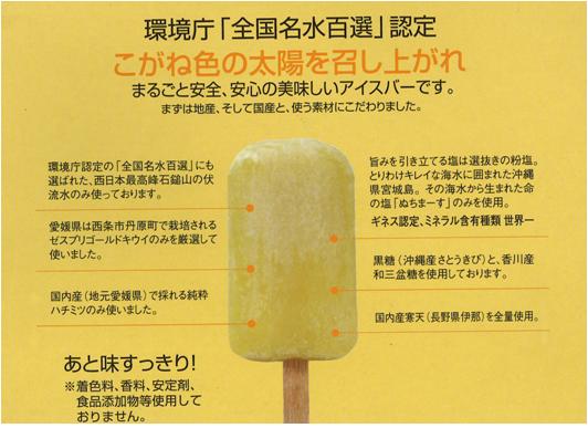 | 商品の特長 | こがね色の太陽召し上がれ。 あと味すっきり、安全、安心の美味しいアイスバーです。 着色料、香料、安定剤等一切使用せず、西条の名水(全国名水百選)を利用しています。 |