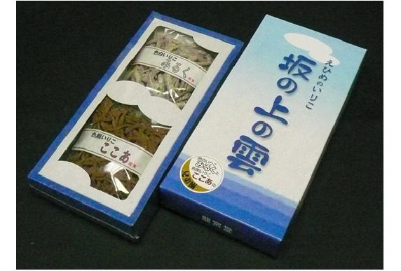 | Description | This is an anchovy snack using the anchovy from Ehime as a main ingredient and it was created by representing the main characters of Akiyama brothers as the motif from the novel, "A wisp of cloud (Saka no Ue no Kumo)". The anchovy was coated with milk and cocoa, expressing the fair-skinned elder brother 'Yoshifuru' and dark-skinned younger brother, "Saneyuki", respectively. The design on the package is the expression of a white cloud of the sky upon the Sea of Japan. |